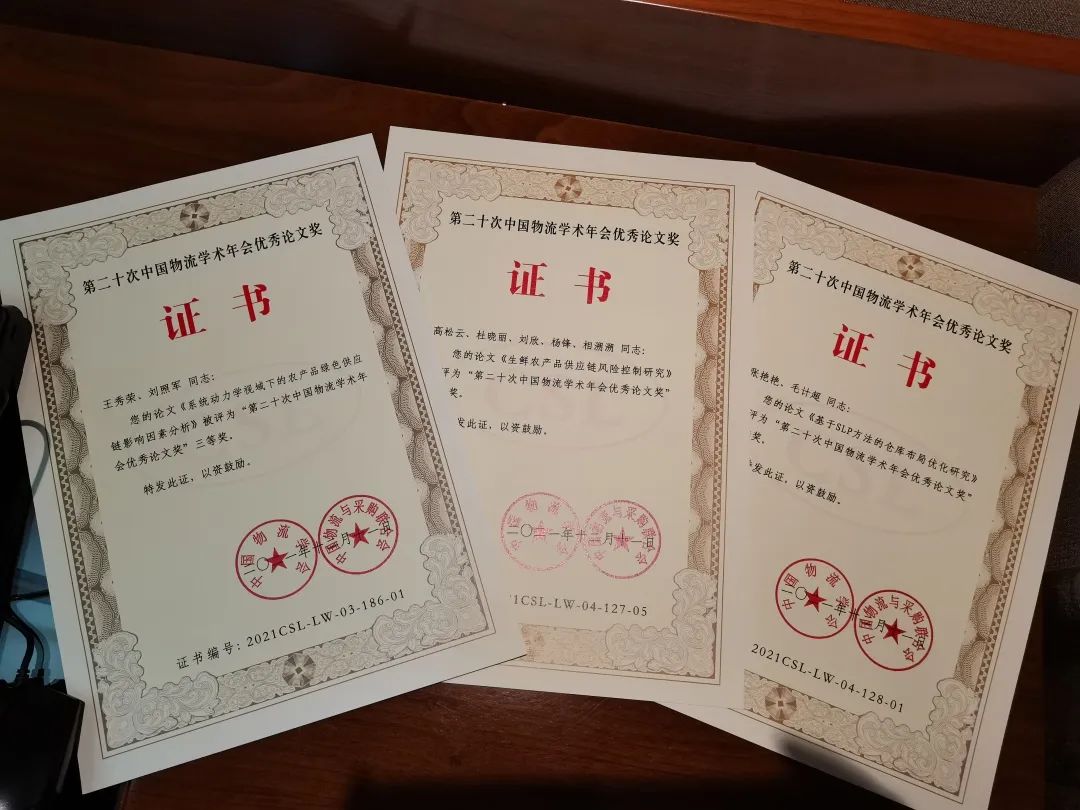 会议期间,颁发了2021年度优秀课题、优秀论文获奖证书,对第六届中国物流学会优秀会员进行了表彰。我院主持完成的课题成果《企业绿色物流发展机理研究》获优秀课题三等奖,提交的论文《系统动力学视域下的农产品绿色供应链影响因素分析》、《生鲜农产品供应链风险控制研究》及《基于SLP方法的仓库布局研究》获优秀论文奖项。