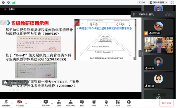 为提升我院教师教育科研水平,增强教师教育科研意识,激发教师投身教育科研工作的积极性,11月15日下午2:00,青岛科技大学董华教授应邀在线做“教学改革项目申报与研究”专题讲座。此次讲座由商学院科研院长徐芹主持,副校长赵晶晶,人事处处长黄岩,商学院院长徐倩、执行院长高敏及全体教师参加。