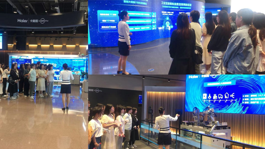 在海尔工业智能研究院卡奥斯工业互联网示范线,学生们参观了全球首个“智能+5G”大规模定制虚实融合示范验证平台,现场体验了个性化定制洗衣机的全过程,加深了对工业互联网平台赋能下的企业个性化定制、智能化制造、数字化管理、服务化延伸的认识理解。学生们还进一步了解了卡奥斯平台在房车物联、工业“人联网”作业感知、工业安全智慧管控、生物医疗安全、衣联网等领域的应用案例。