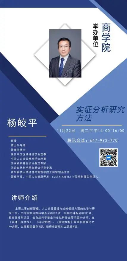2022年11月22日下午15:00,商学院举办主题为《实证分析研究方法》的培训讲座。本次讲座特别邀请青岛科技大学经济与管理学院工商管理系主任杨皎平教授担任主讲。商学院科研院长徐芹主持,采用线上线下两种方式同时进行。