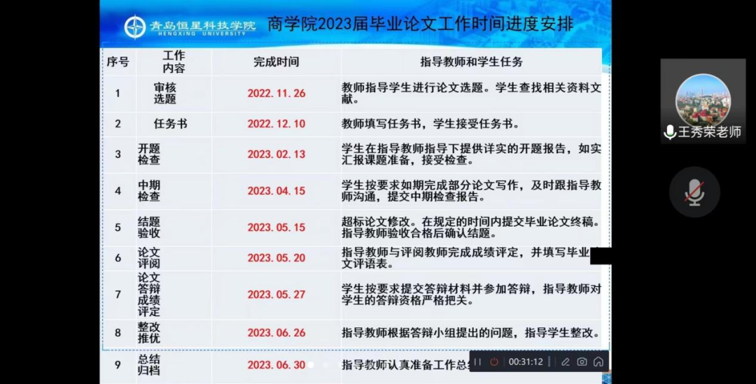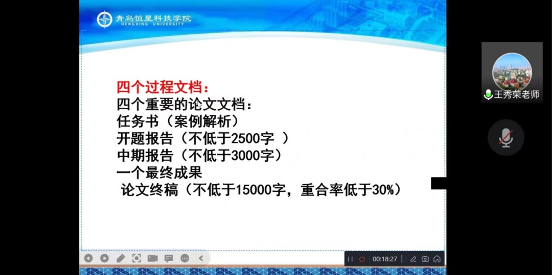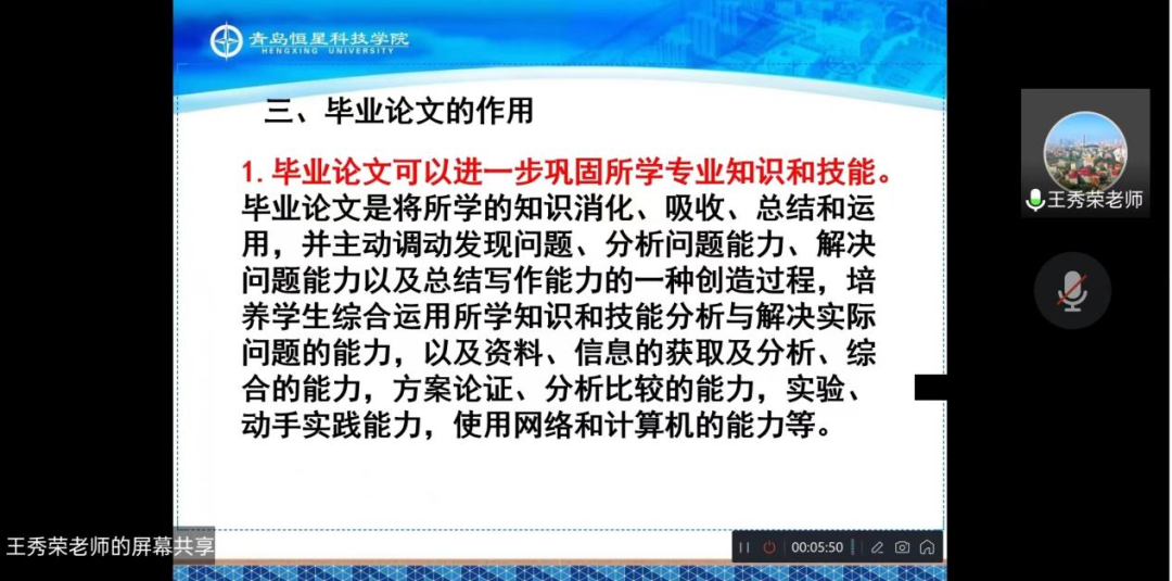 为了提高学生毕业论文撰写能力和对相关规范的认识,制定好未来规划,提升毕业论文质量,青岛恒星科技学院商学院物流工程专业于11月21日晚19时在线举办毕业论文培训会,由王秀荣教授对毕业论文做出写作指导,2019级物流工程专业全体学生和老师参加了本次线上培训会。