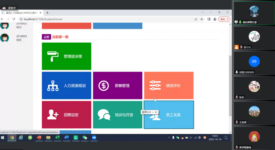 刘经理介绍道,竞争对抗平台每期得分由8项评分指标构成,分别是:净利润、企业成长评分、人力资源规划、薪酬管理、绩效管理、招聘设定、培训与开发、员工关系。其中人力资源规划、薪酬管理、绩效管理、招聘设定、培训与开发、员工关系这六项均是人力资源管理类决策,但净利润与企业成长评分也时刻受到人力资源管理类决策优劣的影响,因此团队应对人力资源评分项给予足够的重视,人力资源管理类决策是影响最终得分的关键因素。此外,刘经理针对备赛的各方面准备进行了纠正和拔高,并提出了许多切实可行的良好训练方法和提升建议。