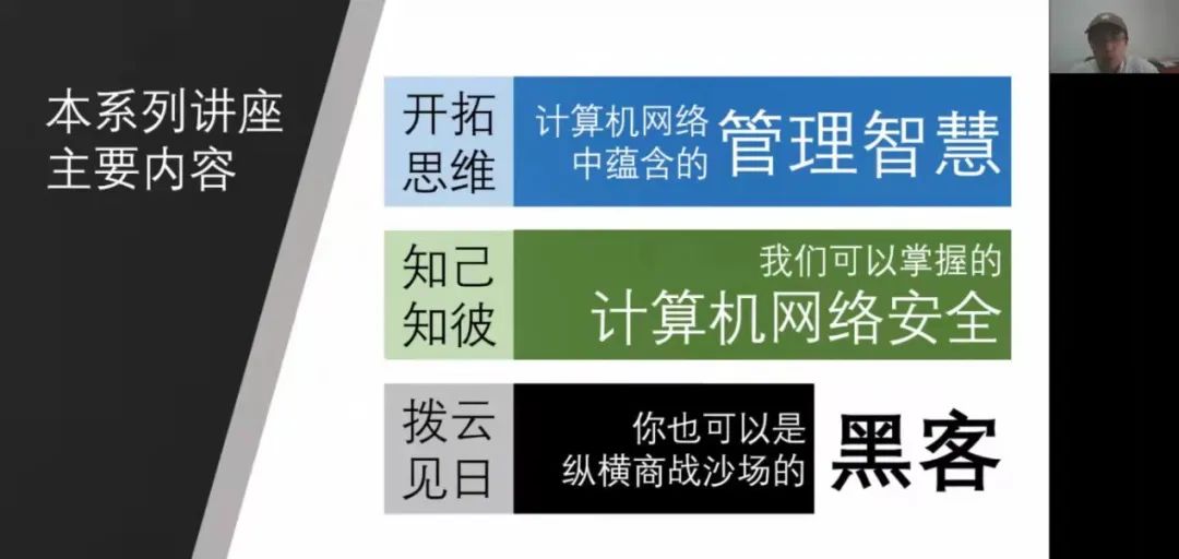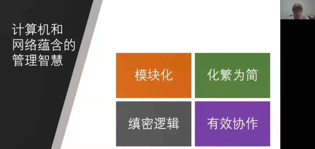 叶展老师在本次讲座中主要介绍了4个在计算机与网络中体现出的管理、经营思想,包括模块化设计、化繁为简注重本质的思维方式、缜密思维和表达,以及有效协作和流程管理。叶老师表示计算机和网络系统在工作时往往能够表现得非常准确、精密和高效,这正是企业运行中所追求的目标。