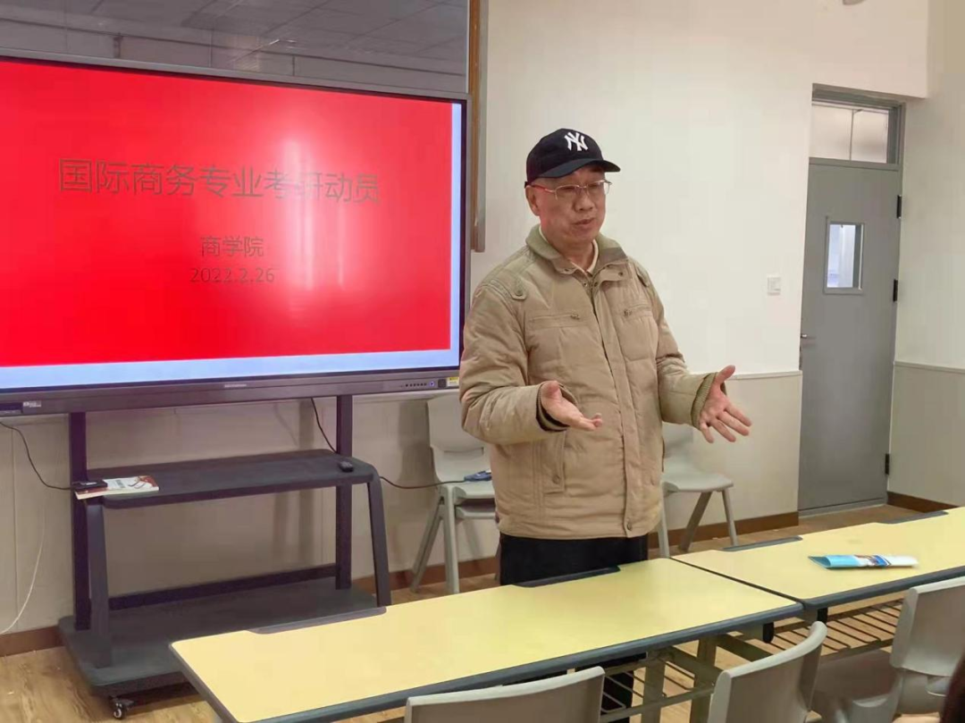 为进一步端正商学院学生对于考研的正确认识,提高应考生考研的积极性与主动性,2022年2月26日下午,商学院国际商务专业考研动员大会在A3-504教室举行。本次动员会特邀崔晓林教授主讲,商学院国商教研室多名教师以及2019级、2021级国际商务专业全体学生参加了本次动员大会,会议由电商教研室主任宋虎岩老师主持。