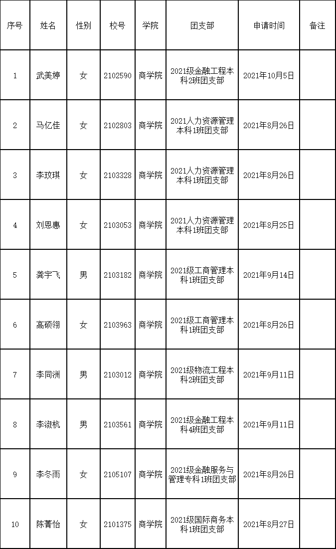 根据《中国共产主义青年团章程》、《关于做好2022年度团员发展工作的通知》等相关要求,经本人自愿申请、团支部推荐、团总支考察,结合在校综合表现,经学院团总支委员会研究决定,拟将武美婷等10名青年学生确定为共青团员发展对象。