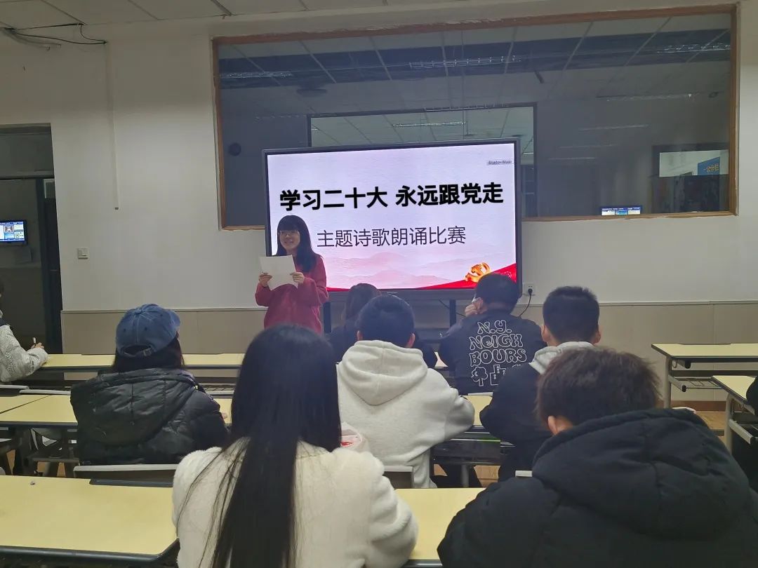 党的二十大报告指出:“青年强,则国家强。当代中国青年生逢其时,施展才干的舞台无比广阔,实现梦想的前景无比光明。”青年是祖国的未来,民族的希望。近日来,为提高商学院学子的爱国热情,增强自我责任感和使命感,营造良好氛围,青岛恒星科技学院商学院于2022年11月23日在A3-504a举办以“学习二十大,永远跟党走”为主题的诗歌朗诵活动。商学院学生积极参与,认真学习贯彻党的二十大精神。